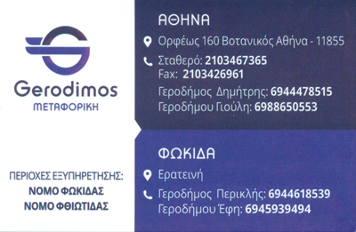 Η μεταφορική Γεροδήμος (Μεταφορική Δωρίδος) μια οικογενειακή επιχείρηση μεπολυετή εμπειρία στο χώρο των διανομών, δραστηριοποιείται στις μεταφορές / μετακομίσειςεντός Αττικής και στο οδικό δίκτυο εξυπηρέτησης των περιοχών του Νομού Φωκίδας και του Νομού Φθιώτιδας.